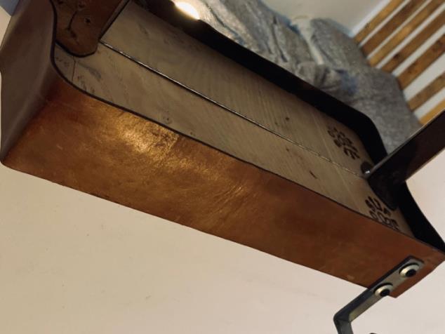 Na parte inferior incluímos unha pequena balda embelecida co coiro da correa dunha vella guitarra, ideal para deixar os produtos de aseo, as flores, as gafas ou as chaves. Mais estas últimas, o mesmo ca o bolso ou a bufanda, tamén poden pendurarse do orixinal gancho.